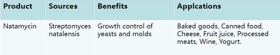 – นาตาไมซิน (Natamycin) คือสารกันเสียที่ใช้กันอย่างกว้างขวาง เป็น Polyene macrolide มีคุณสมบัติในการต่อต้านจุลินทรีย์ได้ทั้งยีสต์และรา แต่ไม่ส่งผลกระทบต่อแบคทีเรีย โปรโตซัว และไวรัส ใช้ได้กับผลิตภัณฑ์อาหารที่หลายหลาย อีกทั้งยังสามารถใช้ในการห่อหุ้มหรือการสร้างฟิลม์